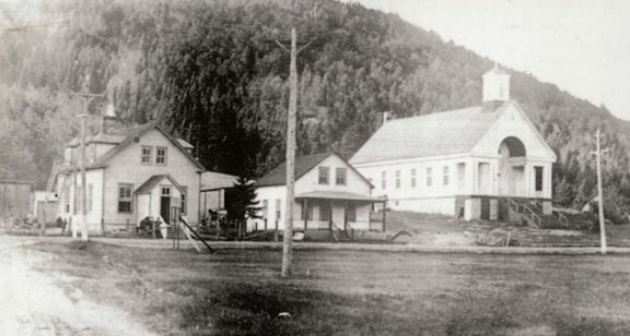 L'ancienne école, le premier presbytère et l'église vers 1925