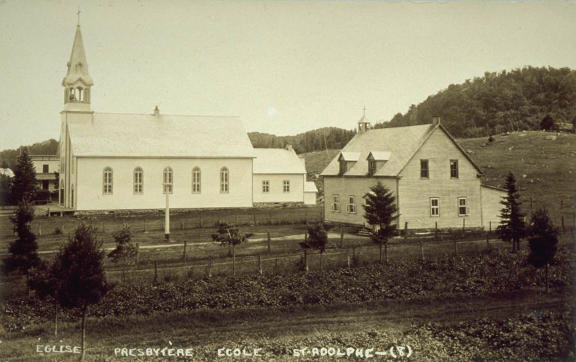 L'église et l'école vers 1920 (carte postale anonyme, collection BAnQ)