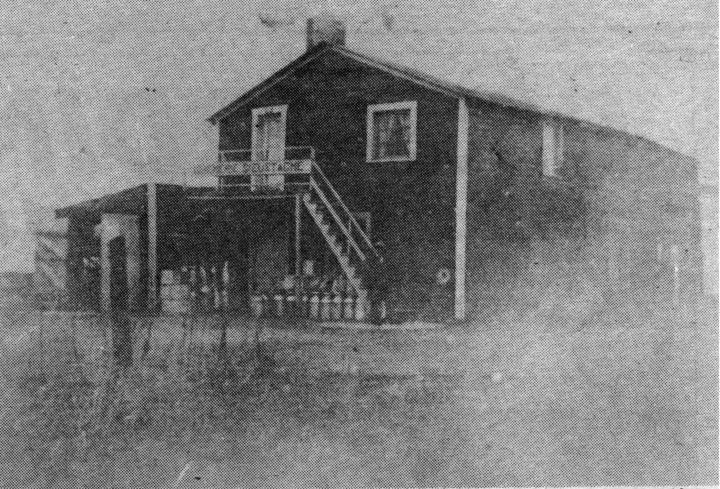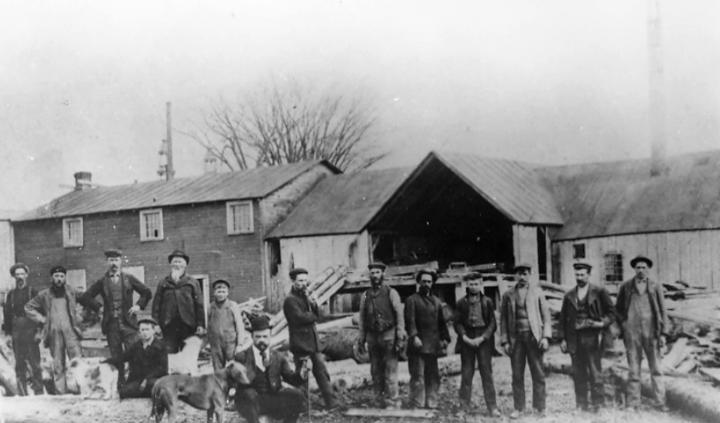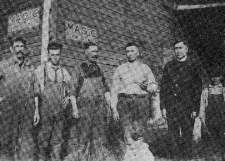 Devant la beurrerie en 1923. De gauche à droite : Thomas Brunette, Rosario Rochon, Joseph Dufour,