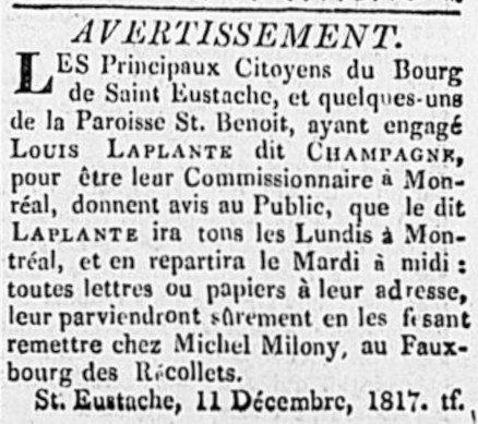 Publicité de Louis Laplante, commissionnaire, en 1817.