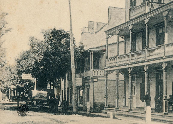 Au centre, on aperçoit la façade et les hauts murs coupe-feu de la maison McGillis-Bowie.