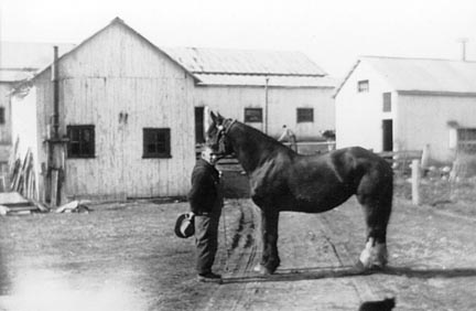 Les bâtiments à l'arrière de la maison et Alphonse «Bidou» Rochon, alors propriétaire de la maison (collection Marie-Michelle Renaud)