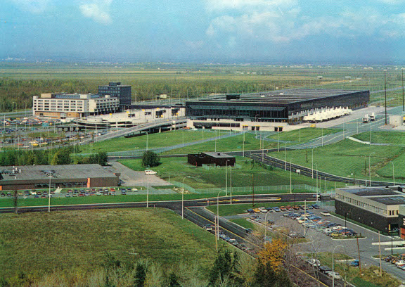 Les installations vers 1970. À gauche, l'hôtel et l'immeuble administratif, à droite l'aérogare. (carte postale par Distributions Benjamin, collection MGV)