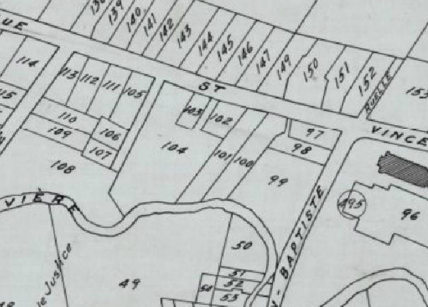 Les moulins étaient situés sur le lot 104 (plan cadastral de 1880 par l'arpenteur J.H. Leclair, BAnQ E21,S555,SS3,SSS1,P6.1)