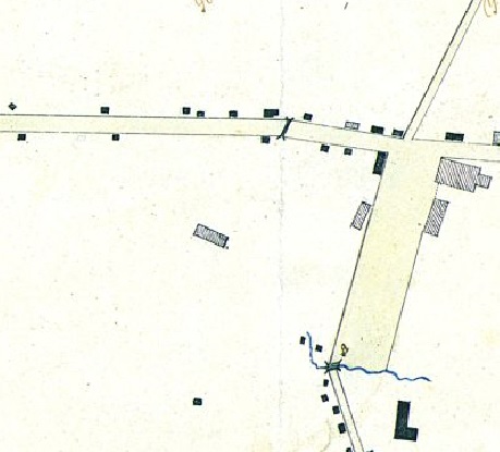 Au centre de l'image, le rectangle gris correspond au moulin, en 1854 (note: la rivière n'a pas été intégralement dessinée) (détail d'un plan de l'arpenteur Godefroy Laviolette, BAnQ E21,S555,SS1,SSS23,PS.2)