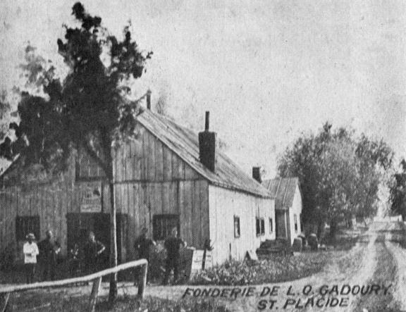 À l'extrême gauche, la fonderie à une date inconnue (photo tirée de Saint-Placide sur le lac 1852-2002, page 454)
