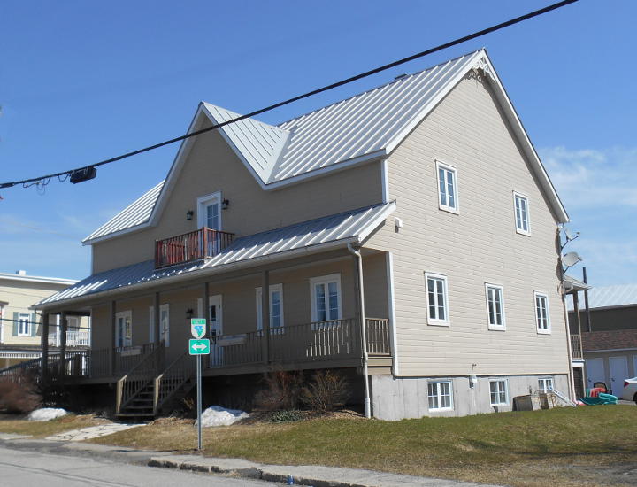 À l'extrême gauche, la maison qui deviendra le second hôtel (lot 43). La troisième maison, derrière le poteau électrique est le premier hôtel (lot 44). (photo tirée de l'Album des Deux-Montagnes, publié en 1957)
