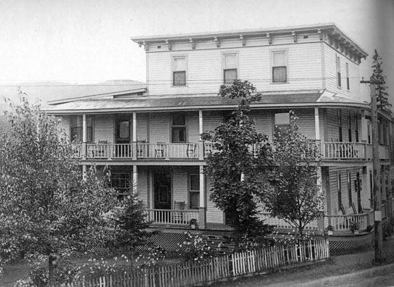 L'hôtel Leroux vers 1915. La pancarte indique «M. Deschambault, maison de pension»