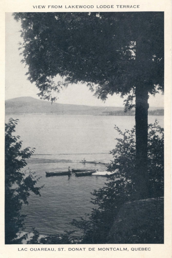 Le lac Ouareau vu de la terrasse du «Lakewood Lodge», vers 1945 (carte postale anonyme) |