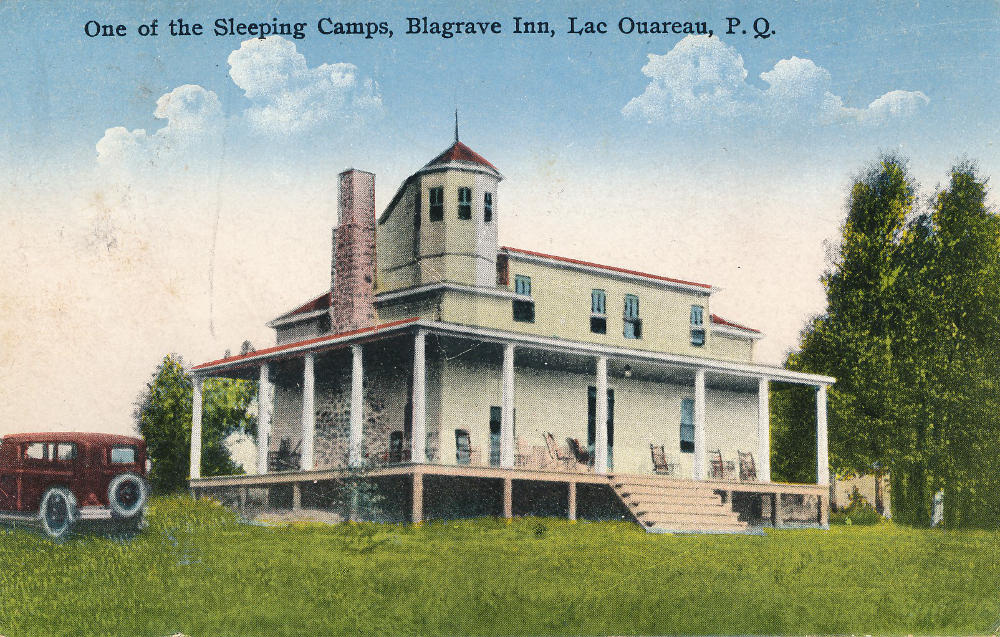 Le «Blagrave Inn» au lac Ouareau, vers 1930 (carte postale par Novelty Manufacturing & Art oblitérée en 1936) |