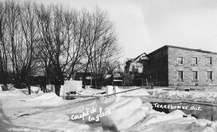 Terrebonne - La coupe de la glace devant les moulins, vers 1945 (carte postale anonyme) |